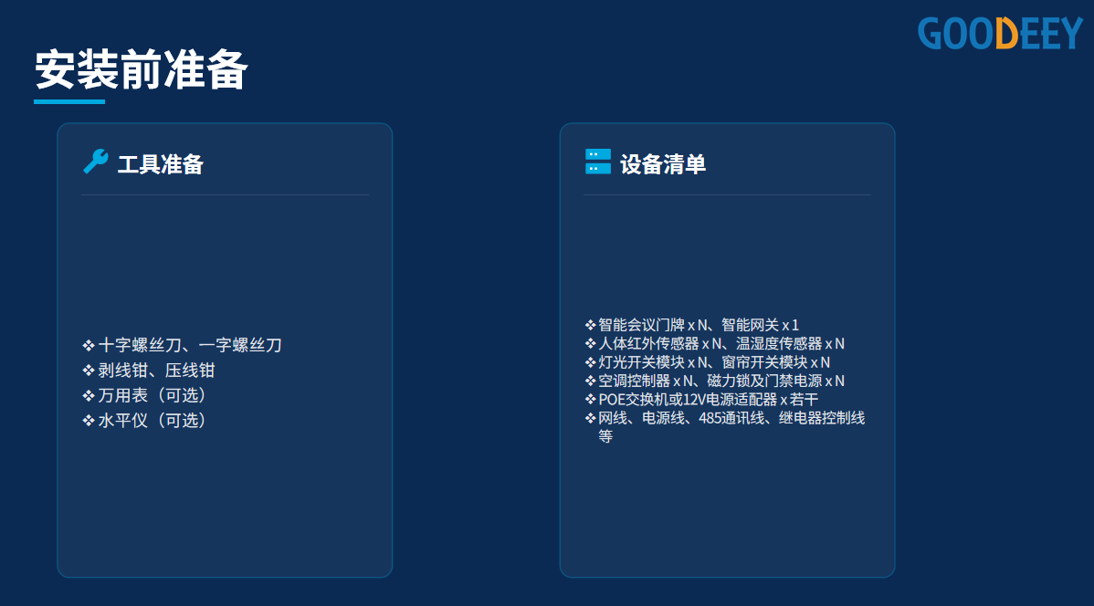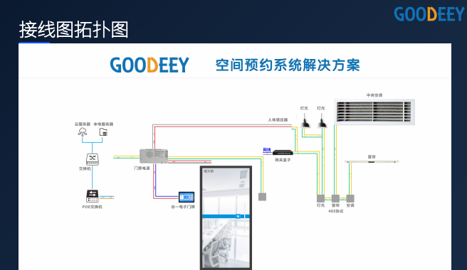 买了GOODEEY谷一科技电子会议门牌,却担心安装复杂、需要专业师傅上门?别慌!这款主打“省心高效”的电子门牌,安装难度堪比“插电源开电脑”,不用凿墙布线、不用复杂调试,自己动手10分钟就能搞定,小白也能轻松拿捏。 先划重点:GOODEEY谷一科技电子会议门牌采用POE供电设计,一根网线就能实现“供电+数据传输”,不用额外拉电线,老办公室、新场地都能轻松适配,省去布线的麻烦和成本,这也是它安装简单的核心秘诀! **第一步:准备工具,缺一不可** 1. 核心设备:智能会议门牌 x N、智能网关 x 1、人体红外传感器 x N、温湿度传感器 x N、灯光开关模块 x N、窗帘开关模块 x N、空调控制器 x N、磁力锁及门禁电源 x N; 2. 供电设备:POE交换机或12V电源适配器 x 若干(按需选择,POE交换机可实现网线供电+数据传输,12V电源适配器用于非POE设备供电); 3. 线材:超五类/六类网线、电源线、485通讯线、继电器控制线等(网线长度根据安装位置与交换机距离选择,建议预留1-2米余量,其他线材按需准备); 4. 工具:螺丝刀(十字螺丝刀、一字螺丝刀均可,用于固定设备及支架)、剥线钳、压线钳(用于网线及各类通讯线、控制线的接头处理,若线材已提前做好接头可备用); 5. 辅助工具(可选):万用表(用于检测网线通断、供电是否正常)、水平仪(用于校准支架安装,确保门牌水平不歪斜)。  **第二步:固定支架,稳固不晃(新手也能一次到位)** 1. 确定安装位置:选择会议室门口合适位置,建议离地1.3-1.4米,确保门牌屏幕可视且无遮挡,方便路过同事快速查看会议室状态,同时避开潮湿、阳光直射的位置(保护设备,延长使用寿命); 2. 固定背板:将安装背板贴于确定好的墙面,用记号笔标记出背板上的螺丝孔位置;根据墙面材质,选择膨胀螺丝或自攻螺丝,将安装背板固定在墙面,注意墙面需预留86底盒,确保安装稳固、贴合墙面无松动; 3. 安装门牌:将GOODEEY谷一科技电子会议门牌挂扣在安装背板上,向下轻推,确保卡扣完全嵌入背板卡槽,轻轻晃动门牌确认安装牢固,即可完成支架及门牌的固定操作。  **第三步:供电与网络连接,两种方式任选(按需选择更省心)** 请根据实际办公环境选择合适的供电与网络方式,两种方案各有优势,适配不同场景: **方式一:**POE供电与供网(推荐,布线更简洁) 1. 连接设备:使用网线,将会议门牌的网口与POE交换机的POE端口进行连接,确保两端插紧到位,避免接触不良; 2. 供电要求:交换机需提供符合标准的POE供电(如802.3af/at),确保供电稳定,满足会议门牌正常运行需求; 3. 确认状态:插好后,POE交换机会自动给电子门牌供电,同时实现数据传输,此时门牌屏幕会自动亮起,进入开机界面,说明供电与网络连接成功。 **方式二:**12V供电与独立网络(兼容性更强,适配无POE环境) 1. 供电连接:使用12V电源适配器,将适配器输出端连接至会议门牌的DC电源接口,插紧后接通电源适配器电源,确认门牌屏幕亮起,完成供电; 2. 网络连接:使用网线,将会议门牌的网口连接至局域网交换机,确保连接牢固; 3. 确认状态:门牌开机后自动搜索网络,屏幕显示正常且无网络异常提示,即完成供电与网络连接。  **第四步:门禁连接,按逻辑接线更安全** 核心遵循继电器控制逻辑,分步骤完成接线,确保门禁正常受控,具体操作如下: 1. 连接门禁电源:将会议门牌的继电器输出端(NO/NC/COM)接入门禁电源的控制信号端,确保接线对应正确、插紧到位; 2. 连接执行部件:将门禁电源的输出端直接连接至磁力锁,形成完整的受控回路,保障门禁开关正常响应; 3. 物理连接检查:接线完成后,务必检查所有端子是否牢固,避免松动、接触不良导致短路,影响设备正常运行及使用安全。   *安全规范操作:强电操作存在风险,请严格参照门禁电源说明书进行接线。操作前务必断开总电源,防止触电。* 作为GOODEEY谷一科技空间预约管理系统的“好搭档”,这款电子门牌不仅安装省心,还能完美解决会议室管理的各种痛点,搭配系统使用,让办公更高效、更省心。