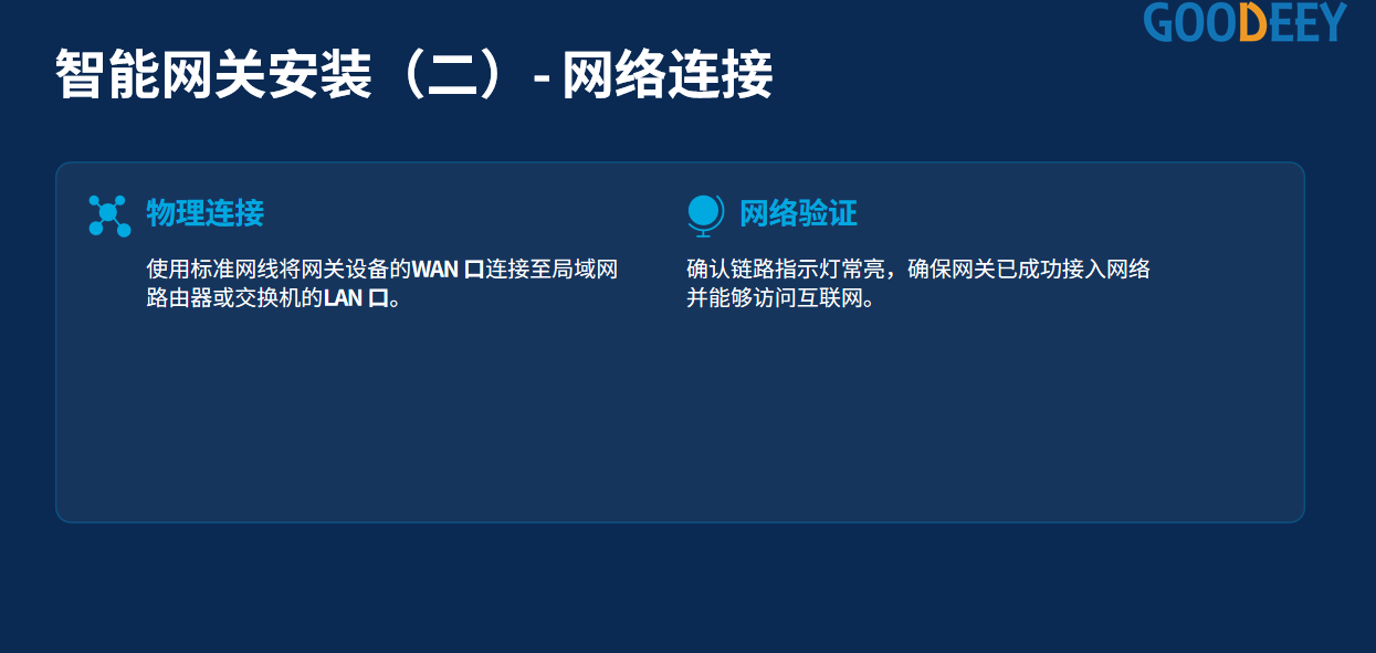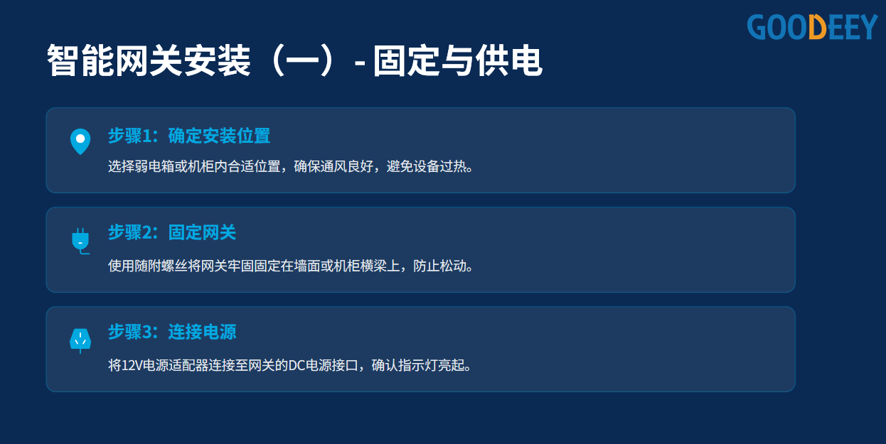 一、固定与供电  1. 确定安装位置 - 选择安装位置时,需确保网关周围无强电磁干扰(如大功率电器、信号屏蔽设备),且距离网络路由器、485设备的安装区域均不宜过远,减少后续布线难度。 - 安装面需保持平整、干燥,优先选择墙面或设备机柜内侧,避免安装在潮湿、暴晒或易被碰撞的位置,保障网关稳定运行。 - 预留足够的操作空间,方便后续接线、调试及设备维护。 2. 固定网关 - 若网关为壁挂式设计,先根据机身预留的安装孔位,在选定位置用冲击钻打孔(孔径匹配配套膨胀螺丝),孔距与安装孔位完全对应。 - 插入膨胀螺丝并拧紧,将网关通过螺丝固定在墙面或机柜上,确保固定牢固,无松动、倾斜情况。 - 若网关为桌面式设计,直接放置在平整的设备支架或台面,可搭配防滑脚垫增强稳定性,避免设备移位。 3. 连接电源 - 核对网关额定电压、电流参数,匹配对应的电源适配器(严禁使用非适配电源,避免设备烧毁)。 - 将电源适配器一端插入市电插座,另一端接口与网关的电源输入接口紧密连接,确保插头插紧、无接触不良。 - 通电后观察网关电源指示灯,正常情况下指示灯会常亮或按说明书指示闪烁(不同品牌指示灯状态略有差异,以产品手册为准),初步确认供电正常。 二、网络连接  1. 物理连接 - 找到网关的网口(通常标注“WAN”或“网络”),选用千兆网线(保障网络传输速率),一端插入路由器的LAN口,另一端插入网关的网口。 - 网线插入后,观察网口对应的指示灯,若指示灯快速闪烁,说明物理链路连接成功;若无反应,检查网线是否损坏、网口是否插紧。 2. 网络验证 - 通电状态下,等待网关启动完成(启动时间约1-3分钟,具体视设备型号而定)。 - 通过手机或电脑连接与网关同网段的网络,打开浏览器,尝试访问网关的默认管理地址(通常标注在机身标签上,如192.168.1.1)。 - 若能正常加载网关管理登录页面,输入默认账号密码(机身标签标注),即可确认网络连接成功;若无法加载,需排查网线连接、路由器网络是否正常,或重启网关重试。 三、485设备连接  1. 485接线准备 - 准备485通信线(建议采用屏蔽线,减少信号干扰),确认485设备与网关的485接口引脚定义(通常标注“+”“-”或“A”“B”)。 - 关闭网关及所有485设备的电源,避免带电接线导致设备损坏。 2. 接线操作 - 将485通信线的一端,对应连接485设备的“A”“-”引脚与网关的“A”“-”引脚(屏蔽线外层屏蔽层可接地,增强抗干扰能力)。 - 若需连接多个485设备,采用手拉手串联方式,依次将各485设备的“A”“-”引脚与网关的“A”“-”引脚连接,避免分支接线导致信号衰减。 - 接线完成后,检查接线是否牢固,无虚接、错接情况。 四、设备调试与测试  1. 检查所有接线 - 调试前再次全面检查所有接线,重点核对:电源接线是否牢固、无松动,网线两端是否插紧(网口指示灯状态正常),485设备接线是否对应(无错接、虚接、漏接),屏蔽线接地是否规范。 - 排查接线过程中可能出现的问题,如网线破损、485引脚接反、电源插头接触不良等,确保所有接线符合安装要求,为后续调试奠定基础。 2. 通电测试 - 确认接线无误后,依次开启市电插座、网关电源、485设备电源,观察所有设备的指示灯状态。 - 网关电源指示灯常亮(或按说明书正常闪烁),网口指示灯正常闪烁,485设备电源指示灯正常,说明各设备通电正常;若某设备指示灯不亮,立即断电排查电源接线或设备本身故障。 3. 网络配置 - 通过手机或电脑登录网关管理页面(输入默认管理地址、账号密码),首先修改默认登录密码,保障设备管理安全。 - 根据现场网络环境,配置网关网络参数:选择动态IP(自动获取路由器分配的IP)或静态IP(手动设置固定IP,需与路由器网段一致),配置完成后保存设置,重启网关使配置生效。 - 重启后重新登录管理页面,确认网络连接正常,可正常访问外网(若有需求),确保网关网络通信稳定。 4. 设备发现与添加 - 进入网关管理页面的“设备管理”或“485设备”模块,点击“设备发现”“扫描设备”功能,网关将自动搜索已连接的485设备。 - 扫描完成后,核对发现的设备型号、数量与实际连接的485设备一致,选中所有设备并点击“添加”,将设备录入网关管理系统。 - 若未发现设备,重新检查485接线(引脚是否接反、接线是否牢固)、485设备电源是否正常,重启网关后再次扫描尝试。 5. 功能测试 - 单个设备功能测试:针对每台添加成功的485设备,在管理页面执行对应操作,验证设备功能是否正常。例如:门禁设备测试开门/关门指令、传感器设备测试数据采集与上传、控制器设备测试指令执行反馈等,确保每台设备均可正常响应网关指令。 - 联动功能测试:测试网关与485设备、网络的联动效果,如通过网关远程控制485设备启停,查看管理页面是否能实时同步设备状态、采集数据;断开网络后,检查网关是否能缓存设备数据,恢复网络后是否能自动同步上传。 - 稳定性测试:让网关及所有485设备持续运行24小时以上,期间定期检查设备指示灯、管理页面数据更新情况,确认无设备掉线、数据丢失、指令执行异常等问题,确保整个系统稳定运行。
