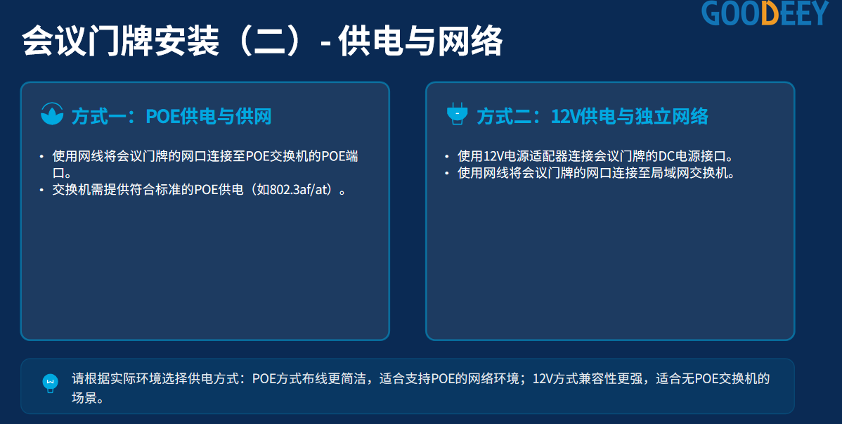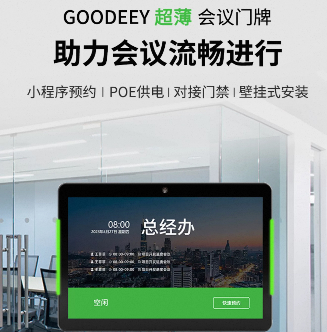 在GOODEEY谷一科技规模化发展、数字化升级的进程中,会议室作为企业技术研发、客户洽谈、团队协同的核心场景,其管理效率直接影响企业核心竞争力。GOODEEY谷一科技会议室电子门牌,以全场景适配、高灵活配置、强生态联动的优势,打破传统会议室管理壁垒,为企业智慧办公注入新动能,以下是其核心优势分条解析: **一、双供电模式,适配全场景办公,告别布线困扰** 贴合GOODEEY谷一科技办公区域多样性(现代化办公区、研发实验室、生产周边洽谈区等),两种供电方式灵活切换,适配不同布线条件: - POE供电:一根网线实现供电+供网一体化,无需额外铺设电源线,安装便捷整洁,大幅降低施工成本,适合新装修办公区、客户接待区及布线不便的区域; - 常规电源供电:接入220V电源即可搭配无线网络运行,无需改造现有线路,轻松实现旧办公区智能化升级,兼顾便捷性与实用性。  **二、双部署方案,兼顾效率与安全,适配企业发展需求** 针对GOODEEY谷一科技核心资料(技术研发、客户信息、产业规划等)的安全需求,提供两种部署模式,适配企业不同阶段办公场景: - SaaS部署:云端多租户模式,无需企业投入服务器与运维成本,管理员可通过网页/APP一键配置、远程管理,实现“即插即用”,适配日常会议管理、团队协同场景; - 私有化部署:所有会议数据存储于企业自有服务器,实现100%数据掌控,满足核心技术研讨、重要客户洽谈等保密会议需求,保障数据安全合规。 **三、全生态软件对接,打破信息孤岛,实现办公流程闭环** 深度融入GOODEEY谷一科技现有办公生态,支持多种第三方办公软件无缝对接,彻底解决多平台信息不同步痛点: - 兼容钉钉、飞书、OUTLOOK、企业微信等主流协同工具,以及企业日常使用的办公OA、客户管理系统、日程管理系统,实现会议信息双向同步; - 会议预约后,门牌自动更新会议主题、时间、参与人等信息,变更/取消时即时联动;支持扫码预约、一键释放空闲会议室,避免资源浪费,打通办公协同全流程。 **四、双安装方式,兼顾美观与实用,适配不同空间风格** 结合GOODEEY谷一科技不同办公空间(高端接待室、日常会议室、研发/生产周边洽谈区)的装修需求,两种安装方式自由选择: - 壁挂式安装:配备专用背板,无需复杂开槽,安装快捷,可灵活调整位置,适合现有办公区、研发及生产周边洽谈室; - 内嵌式安装:搭配专用底盒,安装后与墙面融为一体,简洁大气不占空间,适配高端客户接待室、核心会议室,彰显企业现代化形象。 **五、多元附加功能,按需定制,解锁智慧办公更多可能** 可根据GOODEEY谷一科技办公需求,灵活搭配附加功能,打造专属会议室管理方案: - 门铃功能:避免敲门打扰重要会议,提升办公礼仪与企业专业度; - 门禁+人脸识别:实现“刷脸开门+会议签到”一体化,保障会议室安全,简化参会与接待流程; - 外置继电器:联动会议室灯光、空调,实现会议启停自动开关,助力企业节能降本; - 人体感应:人员靠近自动点亮屏幕,无人时休眠,兼顾节能与便捷; - 温湿度传感器:实时监测会议室环境,同步显示数据,保障参会体验。  **六、三种固定尺寸可选,精准适配各类会议场景** 针对GOODEEY谷一科技不同会议室的空间大小与使用需求,推出10.1英寸、15.6英寸、21.5英寸三种固定尺寸,全方位覆盖各类场景: - 10.1英寸(小尺寸):精致小巧,节省空间,适合小型洽谈室、研发实验室临时会议室,满足日常小型会议、临时沟通需求; - 15.6英寸(中尺寸):兼顾显示效果与空间适配,屏幕清晰易读,适合常规大小会议室,适配日常团队会议、部门研讨等大多数办公场景; - 21.5英寸(大尺寸):屏幕视野开阔,显示内容丰富,可展示更多会议细节与企业宣传内容(核心产品、企业理念等),适合大型会议室、多功能厅,彰显企业实力与格调。 GOODEEY谷一科技会议室电子门牌,以解决企业办公痛点、提升办公效率为核心,从供电、部署、对接、安装到附加功能、尺寸选择,全方位适配科技企业办公需求。它不仅是会议室的“智能门面”,更是企业智慧办公的“小管家”,助力GOODEEY谷一科技深耕核心领域,实现数字化升级,降本增效,打造具有行业影响力的知名科技企业。