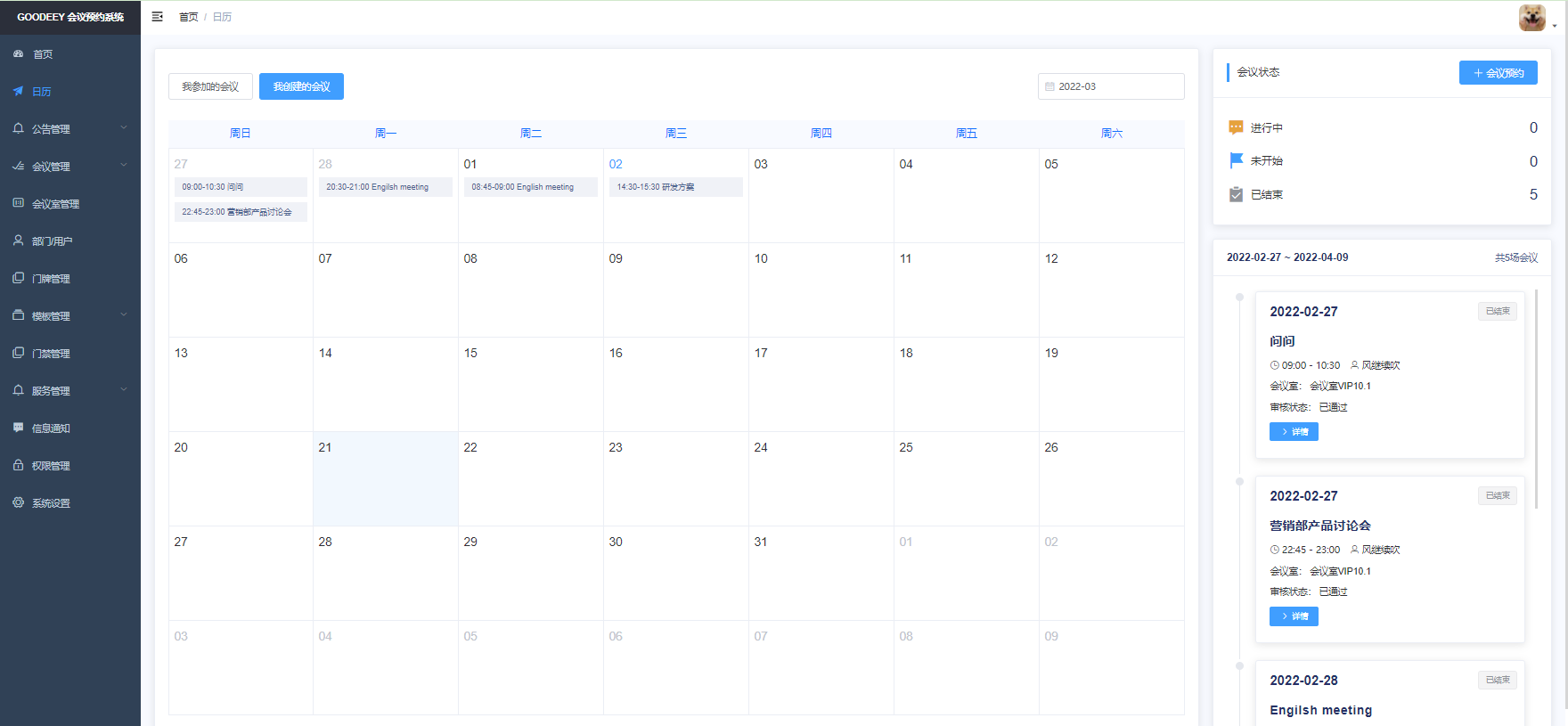 ## 会议预约系统-会议日历 在goodeey会议预约系统首页包含会议日历界面,可以在会议日历中查找会议内容。该界面排版整洁直观,管理员在该界面可以查看公司所有会议信息,非管理员仅展示与自己相关的的会议,在左上角可区分我参加的会议与我创建的会议。  在该界面右上角显示会议状态,查看本月已结束会议数量、正在进行时的会议、未开始的会议,在右上角点击会议预约跳转会议预约界面。下方也会展示该日历界面所有会议信息,按时间排序。点击详情可查看该会议详细内容。  日历界面是Goodeey会议预约系统的重要组成部分,在会议查找及预约方面都可以在该界面进行,经过多次迭代优化,页面简洁、直观,用户反馈效果很好。